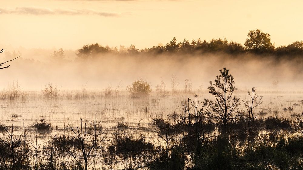 Une matinée fraîche de septembre. Le temps s'étant considérablement refroidi pendant la nuit, de la brume se forme sur l'eau de la tourbière du Leersumse Veld. Le soleil levant illumine la brume et révèle la silhouette d'un arbre.
