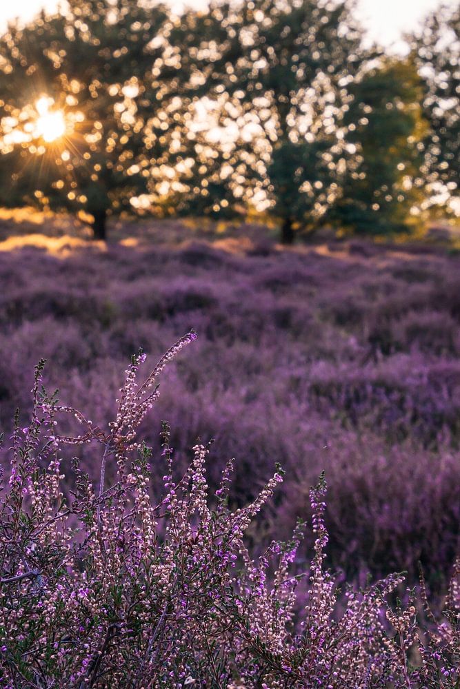 Une photo de détail de bruyère en fleur au premier plan avec le soleil se couchant derrière des arbres à l'arrière-plan. La photo a été prise sur le Posbank près de Rheden.