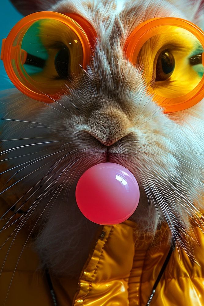Le joyeux lapin porte un manteau d'hiver jaune vif et brillant qui contraste vivement avec l'arrière-plan turquoise. Sur son nez repose une paire de lunettes de soleil orange criardes, dont les verres réfléchissants donnent une impression de profondeur et de mystère. L'élément le plus frappant est la bulle de chewing-gum rose qui sort de sa bouche, donnant à l'image une impression d'espièglerie juvénile. La texture détaillée de la fourrure et la combinaison de couleurs vives attirent et retiennent l'attention, tandis que l'accent mis sur les yeux du lapin ajoute une certaine intensité.