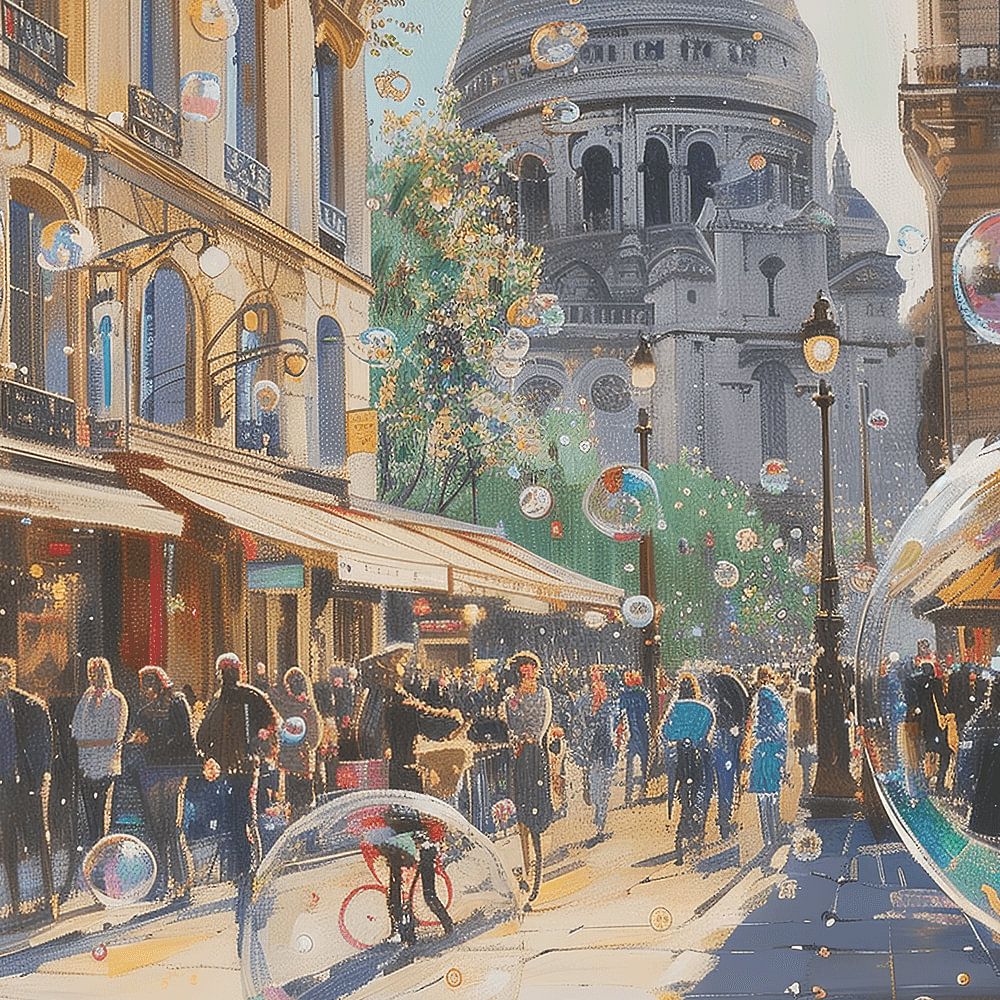 Dans cette œuvre d'art, les bulles de savon ludiques se fondent dans l'agitation de la rue, flottant avec légèreté et insouciance au premier plan, tandis que l'imposant Sacré-Cœur trône en arrière-plan. Les bulles aux couleurs pastel reflètent la lumière de la ville et créent une ambiance féerique qui plonge les spectateurs dans un état de rêverie.