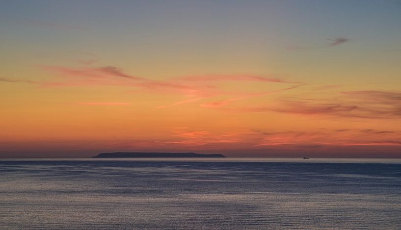 Ciel coloré juste après le coucher du soleil au-dessus du canal de Bristol, avec vue sur l'île de Lundy, dans le sud de l'Angleterre.