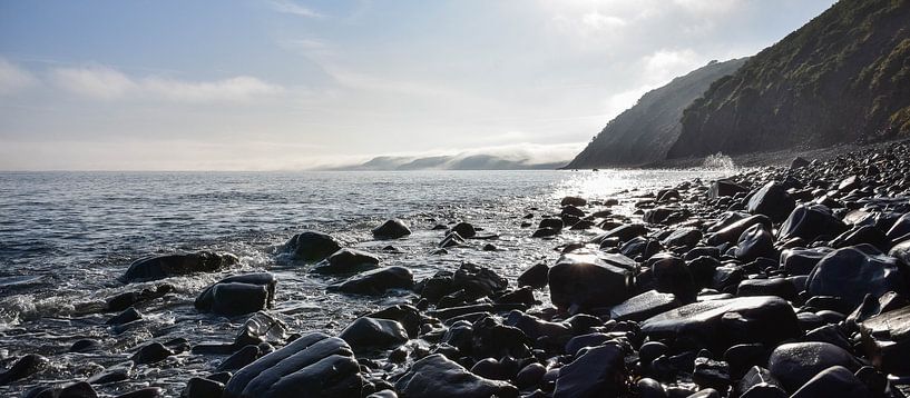 La brume matinale se dissipe au-dessus des falaises de la côte du comté anglais du Devon, près du village de Bucks Mills.