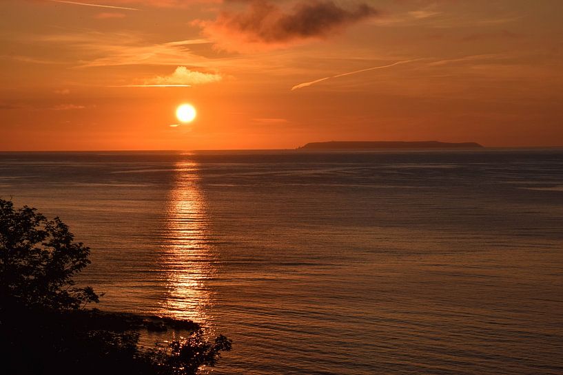 Le soleil se couche sur le canal de Bristol et l'île de Lundy, au sud de l'Angleterre. Photo prise depuis le village côtier de Bucks Mills, dans le comté du Devon.