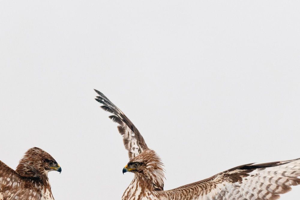 Vechtende Buizerds in de sneeuw in Hongarije. In dreighouding staand met opgeheven vleugels.