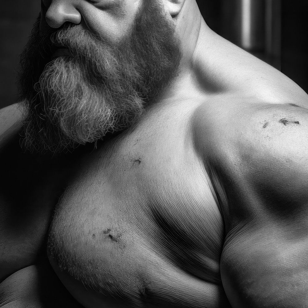 Un am barbu extrêmement musclé dans le style d'une photographie en noir et blanc.