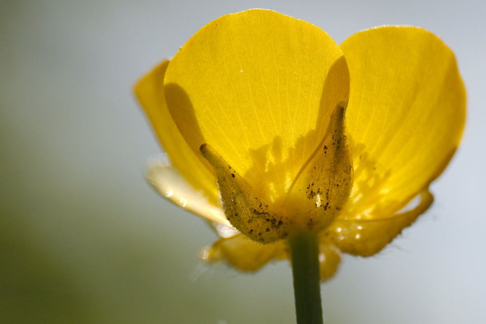 Een mooi geel boterbloempje wordt verlicht door de zon, bekeken vanuit het kikkerperspectief. Hoe een kleine bloem groot kan lijken.