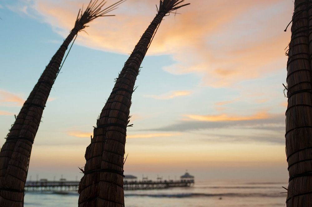 Huanchaco nr Trujillo Peru "Caballitos de totora&quot ; se dressent sur leurs extrémités, silhouettés par le soleil couchant sur l'océan Pacifique. Les caballitos de totora sont des embarcations traditionnelles en roseau que les pêcheurs péruviens utiliseraient depuis trois millénaires.