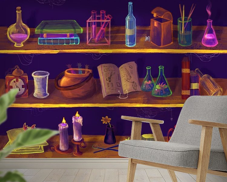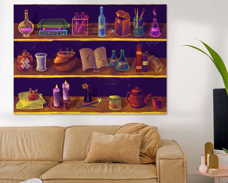 Une armoire aux couleurs gaies, tout droit sortie d'un livre de fantasy : il s'agit en fait de l'armoire d'un sorcier ou d'une sorcière. Des bouteilles excitantes, des livres intéressants et des petits animaux. Idéal pour le mur d'un enfant qui aime la fantaisie !
