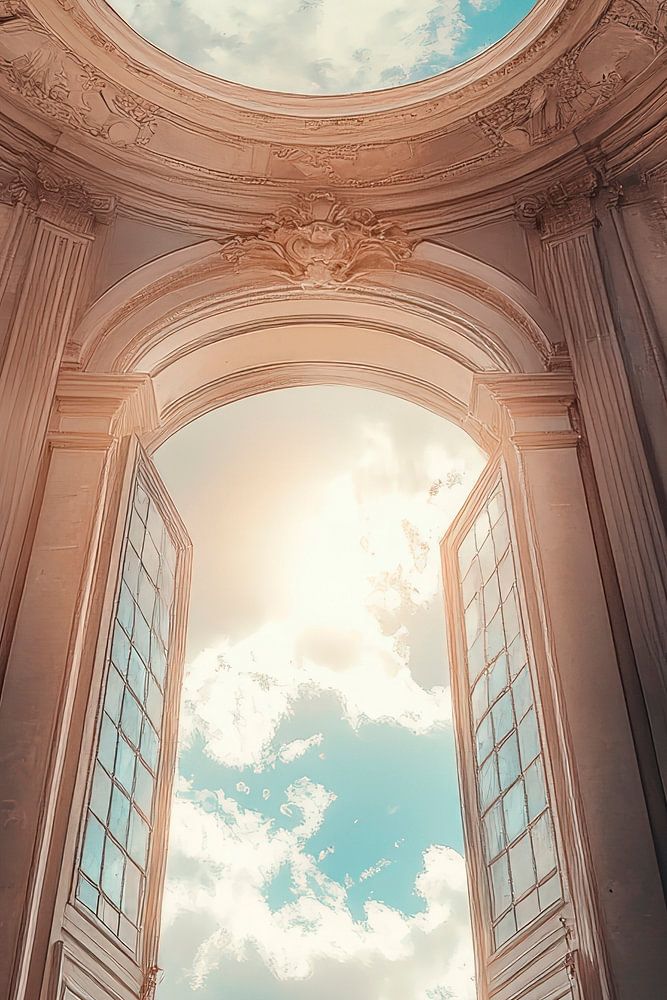 Une entrée majestueuse qui laisse entrevoir un monde céleste. Les doux rayons de lumière qui traversent les portes artistiquement conçues invitent à un moment de calme et d'inspiration. Idéal pour le salon, où ce décor crée une atmosphère accueillante et incite à la rêverie.