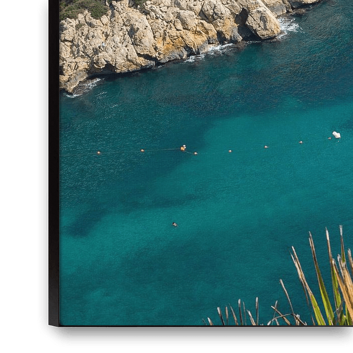 Achetez cette photo Cala de la Granadella, bateaux et falaises par Adriana Mueller sur toile, aluminium, ArtFrame ou photographie (encadrée), impression d'art en haute qualité et tout format.