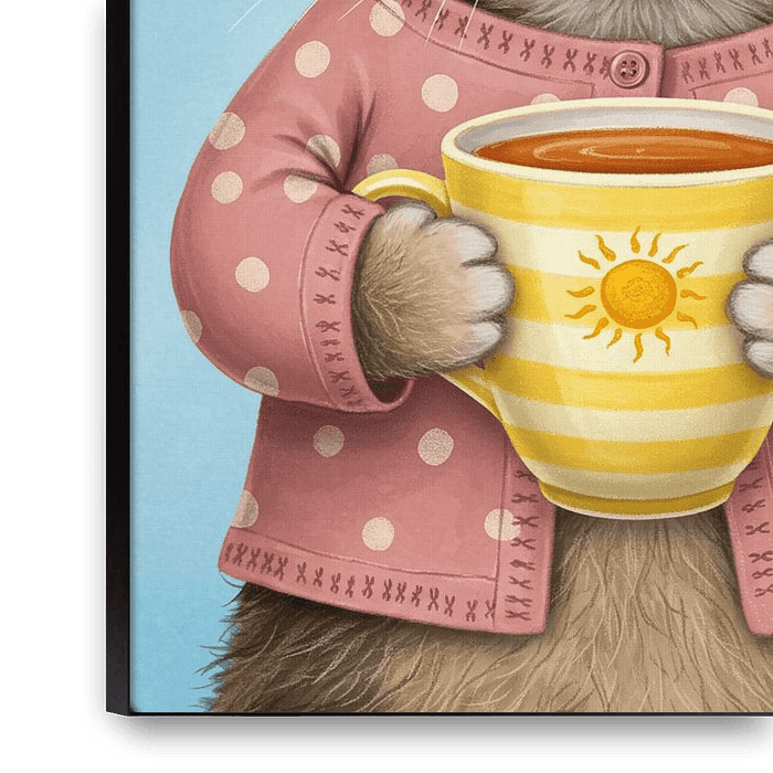 Portrait irrésistiblement doux et innocent d'un chaton persan ou écossais duveteux aux yeux larges et expressifs. Vêtu d'un doux gilet rose à pois, le chaton s'accroche adorablement à un joyeux mug jaune décoré d'un soleil. Le doux arrière-plan bleu layette rehausse l'ambiance légère et douce de la peinture. Cette œuvre est parfaite…