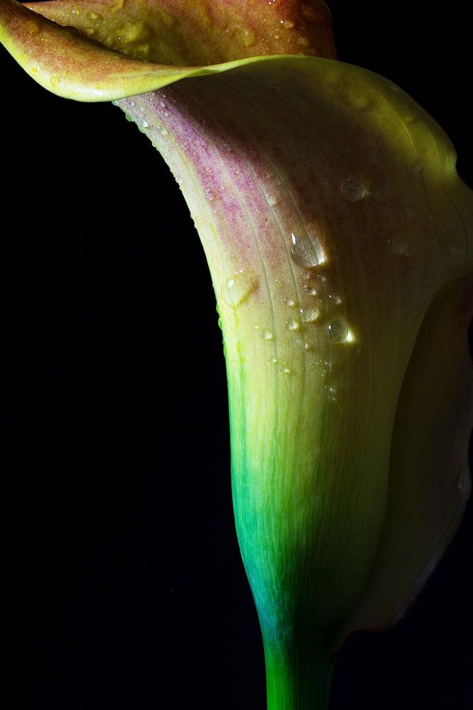 Calla lily (Zantedeschia) dans l'obscurité, tête de fleur sculpturale en vert, jaune et rouge en forme d'entonnoir avec quelques gouttes d'eau sur un fond noir, copy space
