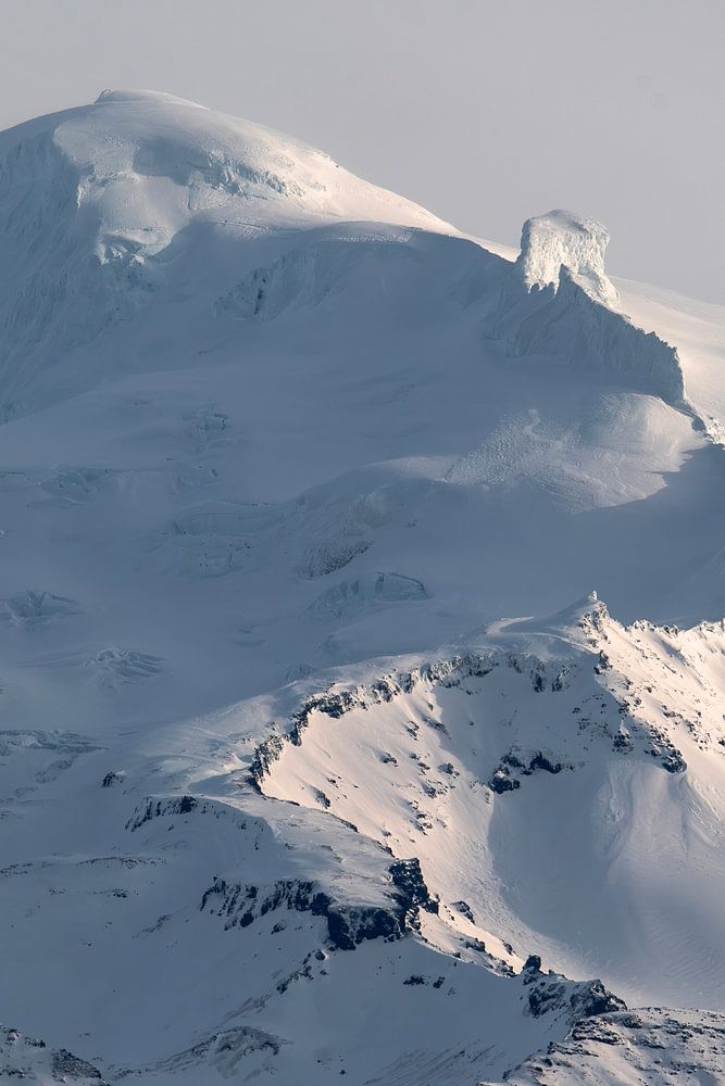 Cette prise de vue majestueuse montre un pic montagneux enneigé s'élevant dans le paysage islandais, enveloppé d'une douce lumière du matin ou du soir. Les ombres accentuent la texture de la calotte glaciaire et les fissures dans la glace, créant une combinaison impressionnante de puissance et d'immobilité. Les gris calmes et les bleus glacés rendent l'image à la fois sereine et monumentale - une expression parfaite de la beauté sauvage de l'Islande.
