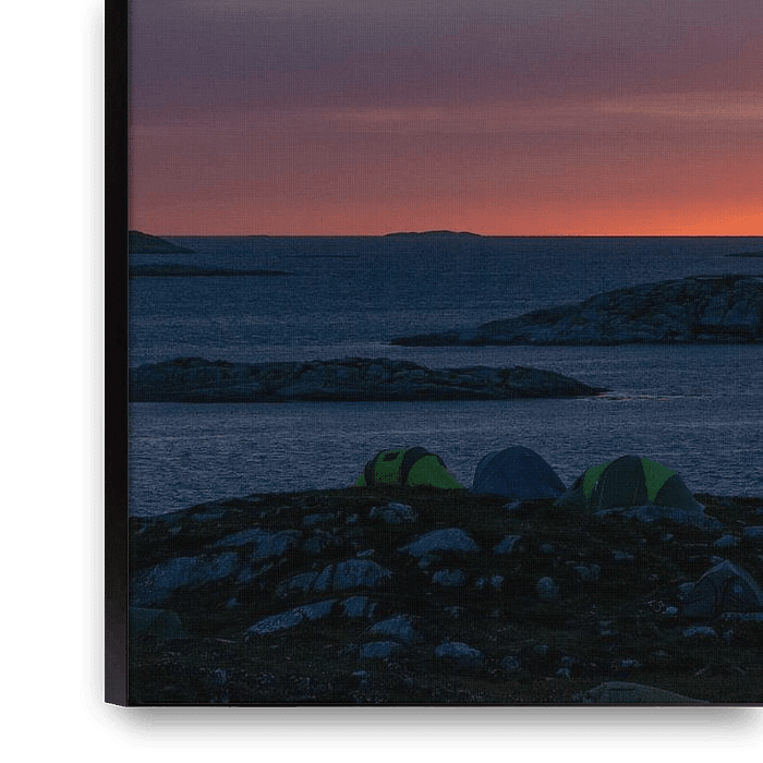 Camper avec le coucher et le lever du soleil, le soleil de minuit. Collection des îles Træna (Treana) de la Norvège du Nord. Les couleurs pastel colorent le ciel et les nuages. 3 Les tentes sont au premier plan.