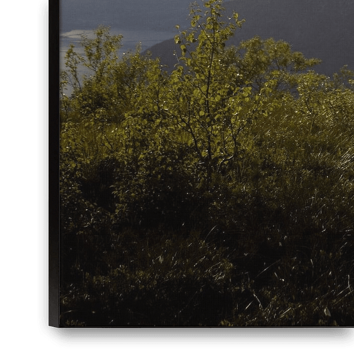 L'arrière-plan est dominé par une imposante montagne sombre au centre, qui se détache nettement sur le ciel. Derrière elle, des couches montagneuses plus profondes disparaissent dans une douce brume bleu-gris, indiquant un vaste paysage de montagne au bord d'un fjord (on aperçoit un peu d'eau en bas à gauche). Le ciel est puissant : un mélange de nuages sombres et inquiétants est ponctué d'un rayonnement solaire brillant (rayons crépusculaires) provenant du coin supérieur gauche, qui illumine une partie du paysage. L'éclairage est atmosphérique : la tente et le premier plan sont baignés d'une lumière chaude, tandis que les montagnes sont plongées dans l'ombre.