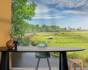 Le Stadsgracht est un élément protégé du paysage de Bunschoten et offre une belle vue sur le moulin à maïs. Cette photo a été prise un jour de printemps avec beaucoup de soleil, ce qui rend les couleurs agréables et lumineuses. Vous pouvez voir des animaux en train de paître à côté de l'eau courbe menant au moulin.