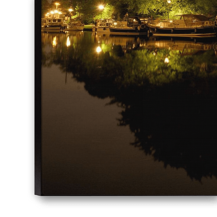 Restaurant De Koperen Tuin et le canal de la ville de Leeuwarder qui sert de port de transit en été photographiés avec une pleine lune, fin juillet 2013.