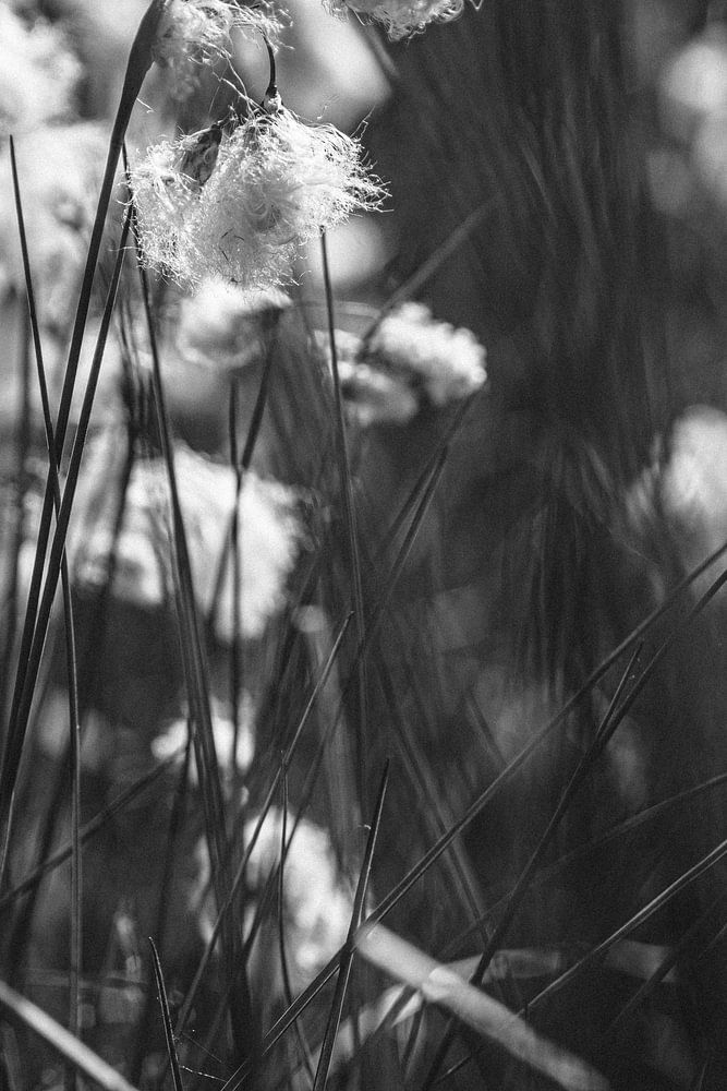 Cette photographie est un cliché atmosphérique en noir et blanc de ce qui est probablement des plantes duveteuses, peut-être des grillons ou une espèce similaire. L'imagerie est rêveuse et poétique, avec un fort jeu d'ombre et de lumière. La mise au point douce sur les plantes au premier plan et l'arrière-plan flou créent un sentiment de profondeur et de tranquillité.