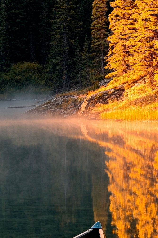 Un matin calme au bord d'un lac tranquille, encadré par les cimes majestueuses des arbres aux reflets dorés. La douce lumière danse à la surface de l'eau et reflète le paysage paisible. Ce décor harmonieux convient parfaitement à un salon, où il évoque la détente et le contact avec la nature.