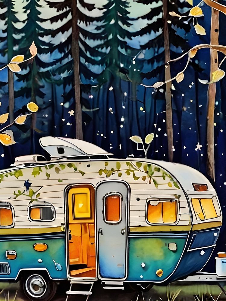 Dans cette œuvre d'art, j'ai capturé une scène atmosphérique d'une forêt nocturne, dans laquelle une caravane vintage est illuminée par la lueur chaude de l'intérieur. L'utilisation de couleurs vives et de lignes ludiques rappelle des styles tels que le travail des illustrateurs des années 70 et l'illustration moderne contemporaine. La lune au-dessus de la caravane émet une lumière douce qui se reflète sur les arbres environnants, créant une atmosphère magique, presque féerique.