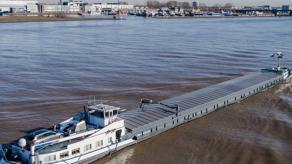 Admirez ce magnifique bateau fluvial naviguant sur la rivière Waal. La photo aérienne de ce cargo à moteur a été prise près du Biesbosch néerlandais. Le nom du navire est : Amarens