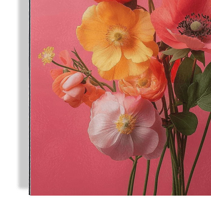 Cette nature morte florale vibrante représente un bouquet luxuriant de coquelicots et de renoncules sur un fond rose chaud. La composition rayonne d’abondance estivale, avec des fleurs à différents stades de croissance qui forment une belle palette de couleurs. Les coquelicots rose tendre et corail contrastent avec les renoncules orange…