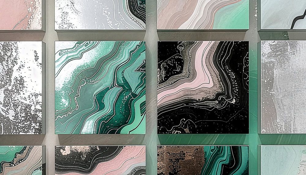 Cette œuvre se déploie comme un champ vibrant composé de carreaux carrés à l'effet tridimensionnel qui s'assemblent pour former une structure apparemment infinie. Chaque surface possède une vie propre marbrée – des motifs fluides et organiques qui rappellent les processus géologiques, les sédiments et les dépôts du temps. Des tons verts…