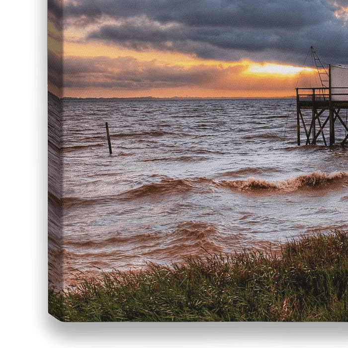 Lors d'un coucher de soleil photographié cabane de pêche français, carrelet. Ce sont typiques de la région autour de la Gironde. Lorsque deux grands fleuves se rencontrent avant qu'ils se jettent dans l'océan Atlantique.