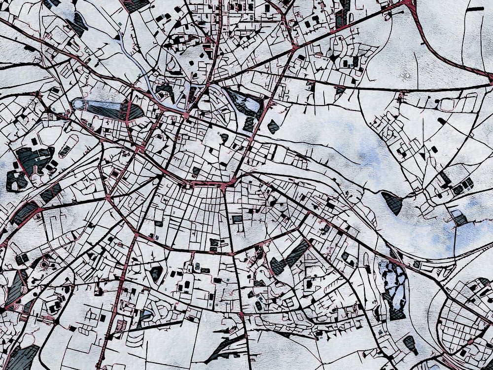 Cette carte de Amiens a été faite à partir de notre style sur mesure "White Winter". Les rues rouge Bordeaux serpentent comme des veines à travers le paysage hivernal. Une épaisse couche de neige blanche recouvre les champs et la ville, tandis que la végétation a perdu ses feuilles et se prépare au printemps dans l'obscurité. Cette carte hivernale de Amiens donne un nouveau look à votre intérieur.