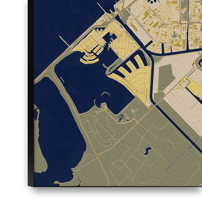 Cette carte de Lelystad s'inspire de la palette de couleurs du tableau "Le baiser" de Gustav Klimt. Les tons bleu foncé et orange donnent à cette carte Lelystad un aspect art déco.
