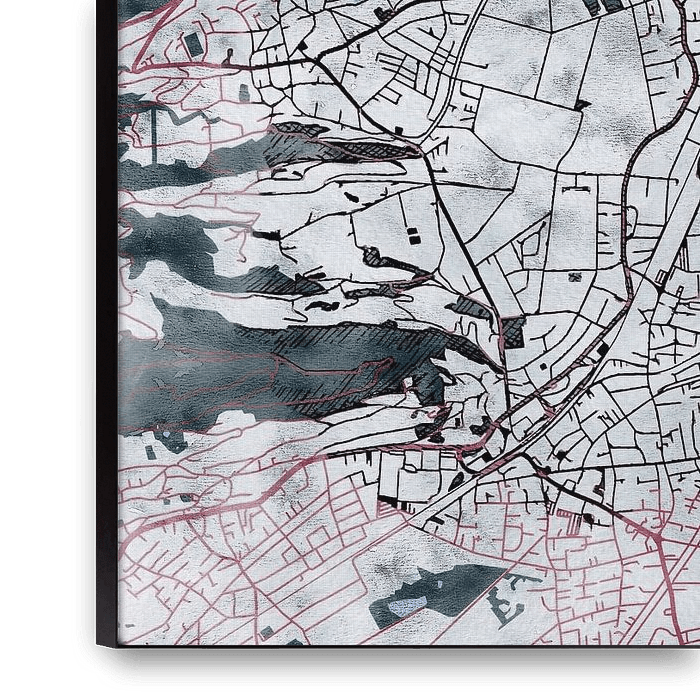 Cette carte de Lustenau a été faite à partir de notre style sur mesure "White Winter". Les rues rouge Bordeaux serpentent comme des veines à travers le paysage hivernal. Une épaisse couche de neige blanche recouvre les champs et la ville, tandis que la végétation a perdu ses feuilles et se prépare au printemps dans…