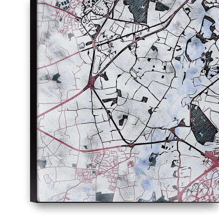 Cette carte de Rennes a été faite à partir de notre style sur mesure "White Winter". Les rues rouge Bordeaux serpentent comme des veines à travers le paysage hivernal. Une épaisse couche de neige blanche recouvre les champs et la ville, tandis que la végétation a perdu ses feuilles et se prépare au printemps dans l'obscurité.…