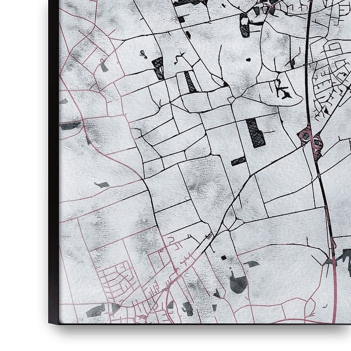 Cette carte de Rheine a été faite à partir de notre style sur mesure "White Winter". Les rues rouge Bordeaux serpentent comme des veines à travers le paysage hivernal. Une épaisse couche de neige blanche recouvre les champs et la ville, tandis que la végétation a perdu ses feuilles et se prépare au printemps dans l'obscurité.…
