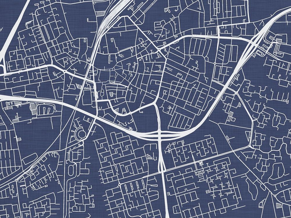 La carte de Roosendaal avec cette carte dans le style Royal Blue. Les routes blanches contrastent avec un fond d'un bleu profond. Associée à une subtile texture en lin, cette carte ajoute une touche de raffinement et de tranquillité à tout espace où elle est exposée.