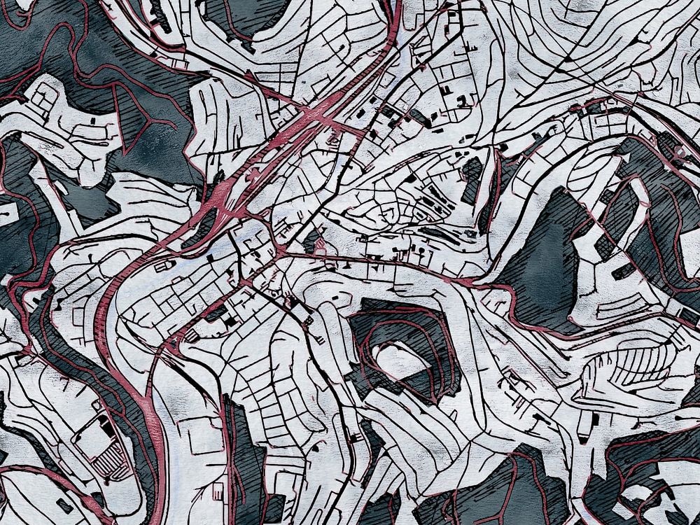 Cette carte de Siegen a été faite à partir de notre style sur mesure "White Winter". Les rues rouge Bordeaux serpentent comme des veines à travers le paysage hivernal. Une épaisse couche de neige blanche recouvre les champs et la ville, tandis que la végétation a perdu ses feuilles et se prépare au printemps dans l'obscurité. Cette carte hivernale de Siegen donne un nouveau look à votre intérieur.