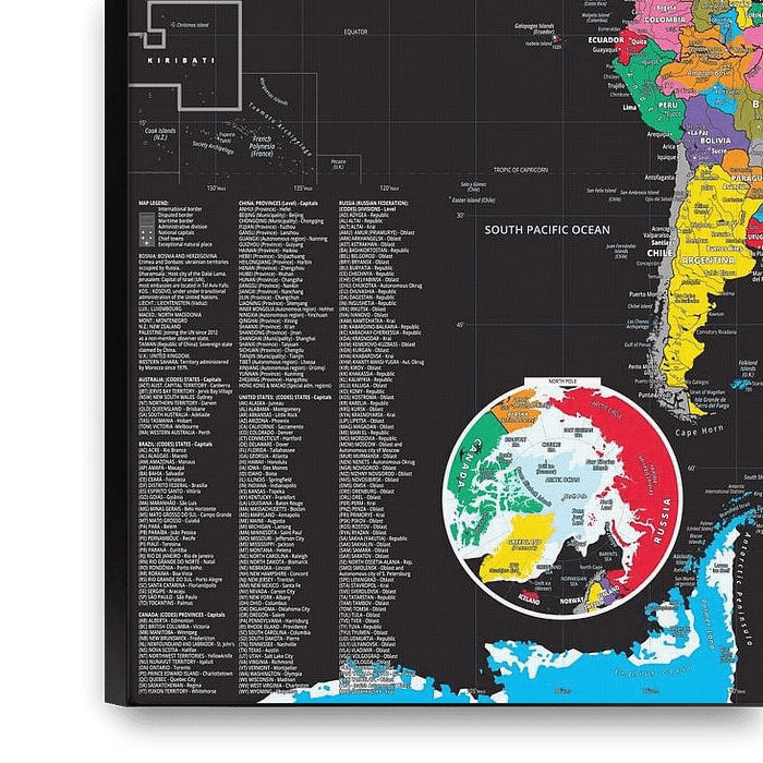 Contenu de la carte du Monde : • Légendes en anglais • Mise à jour : 2025 • Sources : Geoatlas, ONU, CIA, Ministère français des Affaires Étrangères • Projection de Mercator • Relief en 15 courbes de niveaux • 194 États reconnus par l'ONU en 2025 et leurs capitales • Zones sensibles et territoires souverains ou contestés (Palestine, Ukraine, Darfour, Taïwan, Sahara Occidental, Tibet...) • Frontières internationales et frontières maritimes • Découpages administratifs et indexés des grands États (Australie, Brésil, Canada, Chine, États-Unis, Russie) avec chefs-lieux régionaux • Grandes métropoles internationales et autres villes importantes • Pôles Nord et Sud • Fleuves et lacs, massifs et sommets, petites et grandes îles, dépendances • Ligne internationale de changement de date • Plus de 80 grands sites naturels...