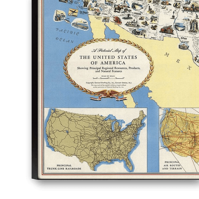 Carte picturale des États-Unis d'Amérique. Carte illustrée en couleur sur la feuille 62x81, pliée pour couvrir 20.5x13.5. Date estimée. Indique les frontières des États, les villes et les villages, les routes, les produits agricoles, les ressources naturelles, l'industrie, les parcs, les principaux édifices et monuments, les activités récréatives, etc. Inclut le texte «Faits sur les États-Unis». Au verso: titre de couverture, carte, char éloigné, texte et illustrations. Relief montré picturalement et par des hachures.