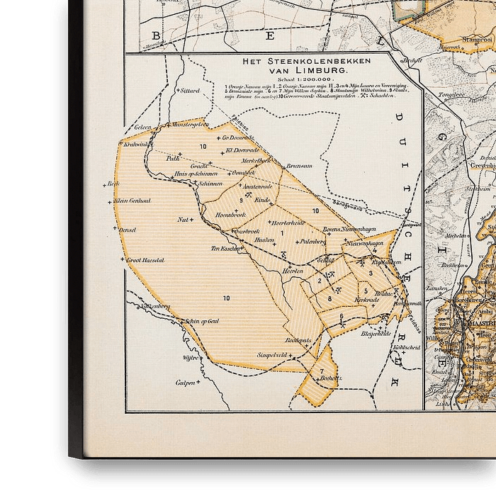 Carte ancienne de la province néerlandaise du Limbourg, datant de 1900. La carte est en couleur. Une section séparée pour le bassin houiller du Limbourg est incluse.