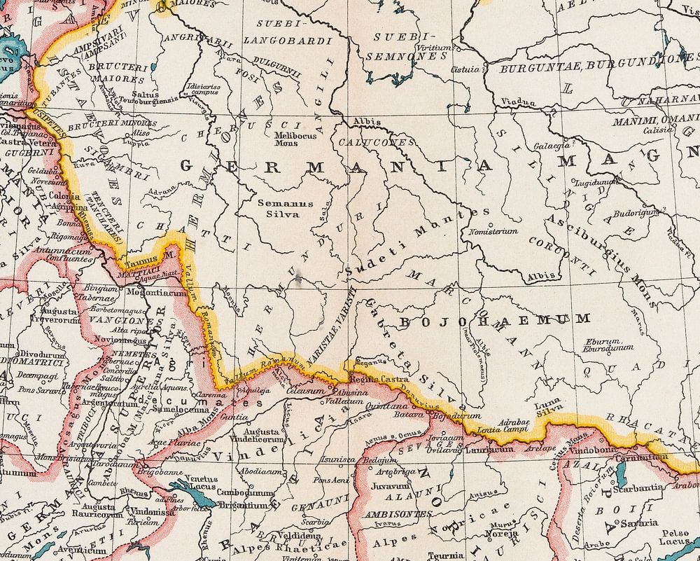 Cette ancienne carte datant d'environ 1900 montre l'Empire germanique au deuxième siècle de notre ère. À côté, on voit l'Empire romain. La carte est en couleur et à l'échelle 1:5 850 000.