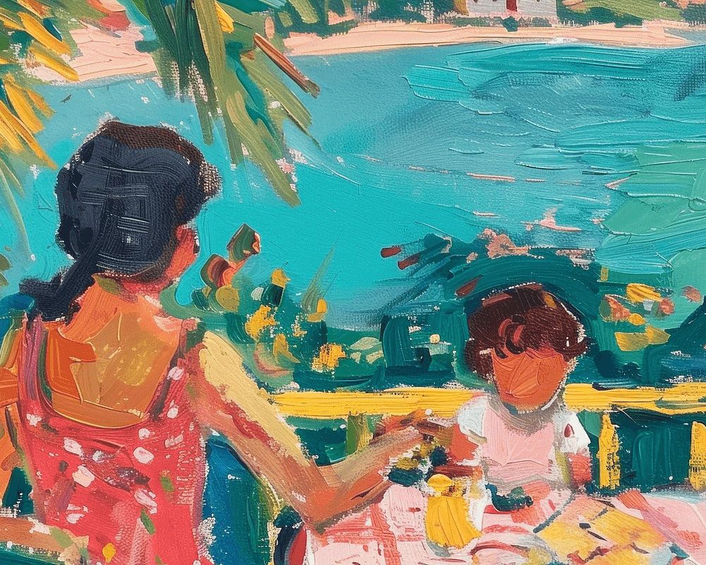 Mère et enfant jouant aux cartes sur un balcon.