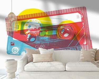Collage de graphiques provenant d'une cassette. Cassette mixte vintage / cassette musicale en 3 couleurs d'impression, rouge, jaune, bleu et les couleurs mélangées créées par superposition. Une image graphique avec un look vintage / rétro nostalgique.