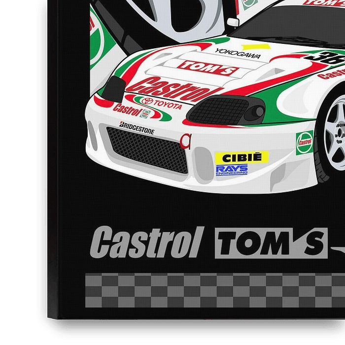 La Castrol TOM's Supra fait référence aux voitures de course emblématiques Toyota Supra, principalement les modèles JGTC/Super GT (Japanese Grand Touring Championship) du milieu à la fin des années 1990, célèbres pour leur livrée Castrol blanche, verte et rouge distinctive, défiant les Nissan Skylines et remportant des championnats, en particulier la légendaire voiture #36 qui a permis à Toyota'de remporter sa première victoire au JGTC en 1995 et le championnat de 1997 grâce à un moteur 4 cylindres unique, devenant des icônes bien-aimées dans les courses et les jeux vidéo comme Gran Turismo®.