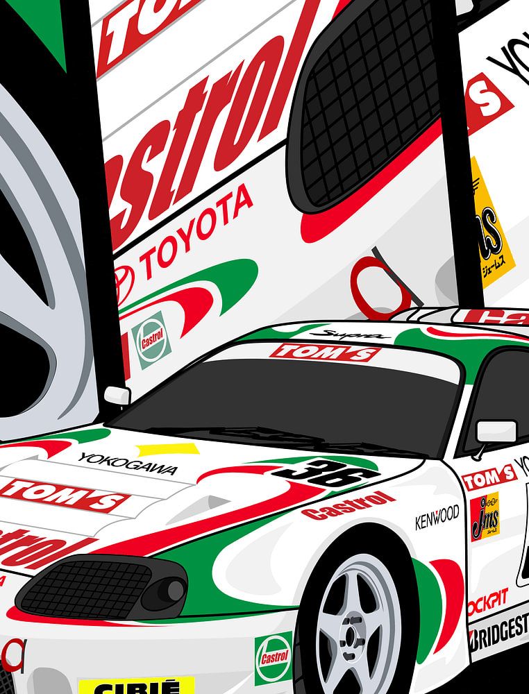 La Castrol TOM's Supra fait référence aux voitures de course emblématiques Toyota Supra, principalement les modèles JGTC/Super GT (Japanese Grand Touring Championship) du milieu à la fin des années 1990, célèbres pour leur livrée Castrol blanche, verte et rouge distinctive, défiant les Nissan Skylines et remportant des…
