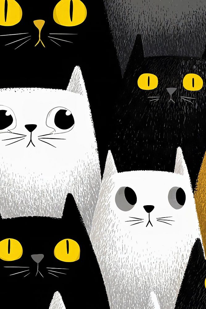 Illustration moderne et minimaliste d'un groupe de chats noirs, blancs et gris aux yeux jaunes saisissants. La composition présente une collection dense de têtes de chats stylisées, formant un motif fascinant. Les contrastes de couleurs et le design simple mais expressif confèrent à l'œuvre une présence graphique puissante.