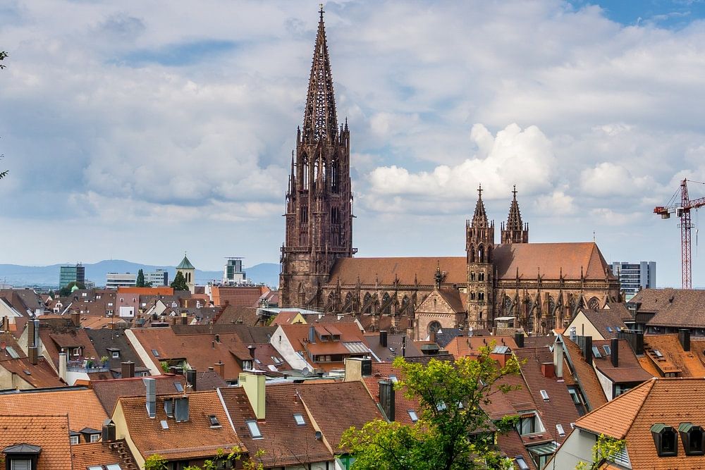 A propos de "Cathédrale de Freiburg im Breisgau entre des arbres verts"