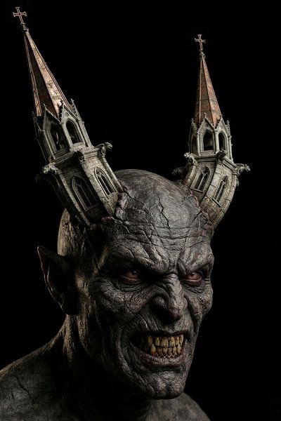 Cette œuvre est provocante et sans compromis. Un visage démoniaque fixe le spectateur avec un sourire qui ne cherche pas à séduire, mais à démasquer. Deux clochers s'élèvent de son crâne comme des cornes — gothiques, érodés, indéniablement reconnaissables. Ici, le sacré n'est pas une force opposée au monstre, mais indissociable de celui-ci. La foi et la menace partagent le même corps.