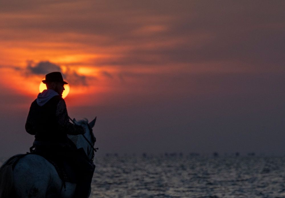 Les chevaux de Camargue sont parfois montés. Les cavaliers sont appelés les gardiens des chevaux. Voici un "gardien" qui monte son cheval dans l'eau salée de la Camargue, en France.