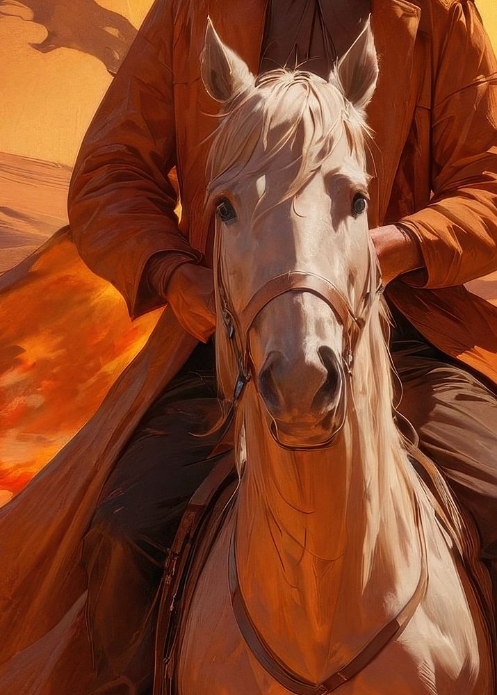 L'éclairage dramatique et la taille surréaliste de la lune amplifient l'impression de mythe et de légende, transformant la scène en quelque chose qui va au-delà du Far West ordinaire - plutôt un western fantastique ou surnaturel. Le feu sous les sabots du cheval suggère soit un embrasement littéral, soit une métaphore de la force imparable, presque divine, du cavalier.