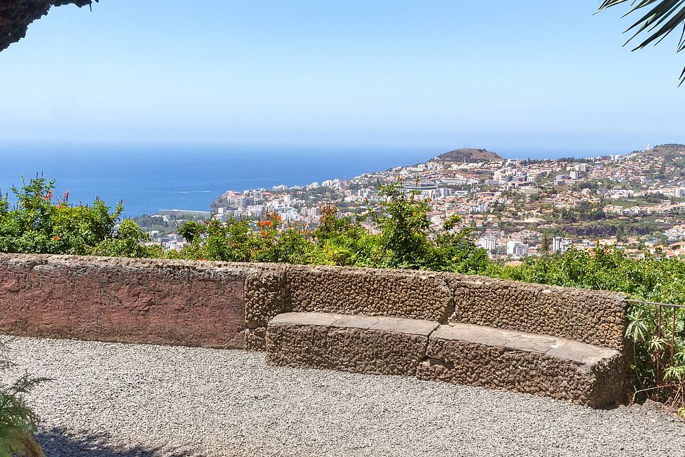 Uitzicht op de kust van het eiland Madeira in Portugal. De foto heb ik gemaakt vanuit een grot in de buurt van een stad. We zien de huizen en het water van de zee in de verte.