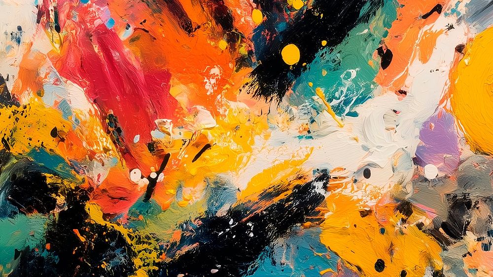 Une peinture expressionniste abstraite avec des coups de pinceau colorés et une composition énergique qui capture l'essence d'une célébration joyeuse. L'œuvre d'art est remplie de lignes et de formes dynamiques dans différentes teintes. Elle contient des éléments tels que des éclaboussures de peinture, des objets abstraits et des motifs fantaisistes qui évoquent des sentiments de bonheur et d'excitation.
